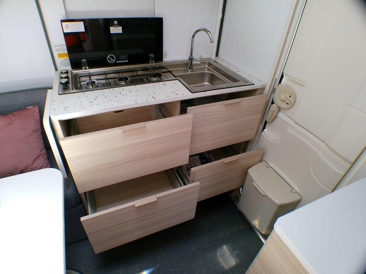The Altea 402 PH Sport is built on a lightweight AL-KO hot-dipped galvanised chassis with independent rubber suspension, giving you smooth, stable towing even with smaller SUVs. Inside, you’re greeted by a beautifully crafted European interior featuring a queen island bed, a full ensuite, and a convertible dinette that allows the van to sleep up to three. The double-glazed windows with integrated blinds and flyscreens, combined with Adria’s exceptional insulation, keep the interior comfortable year-round. The kitchen is fully equipped with a 3-burner cooktop, microwave, and fridge. Every inch of this caravan is designed to maximise comfort, storage, and usability — all wrapped in a sleek, modern exterior that looks incredible on the road or at camp.