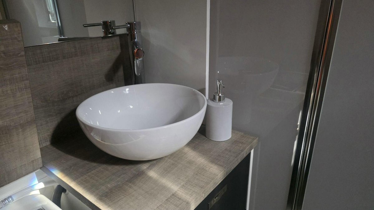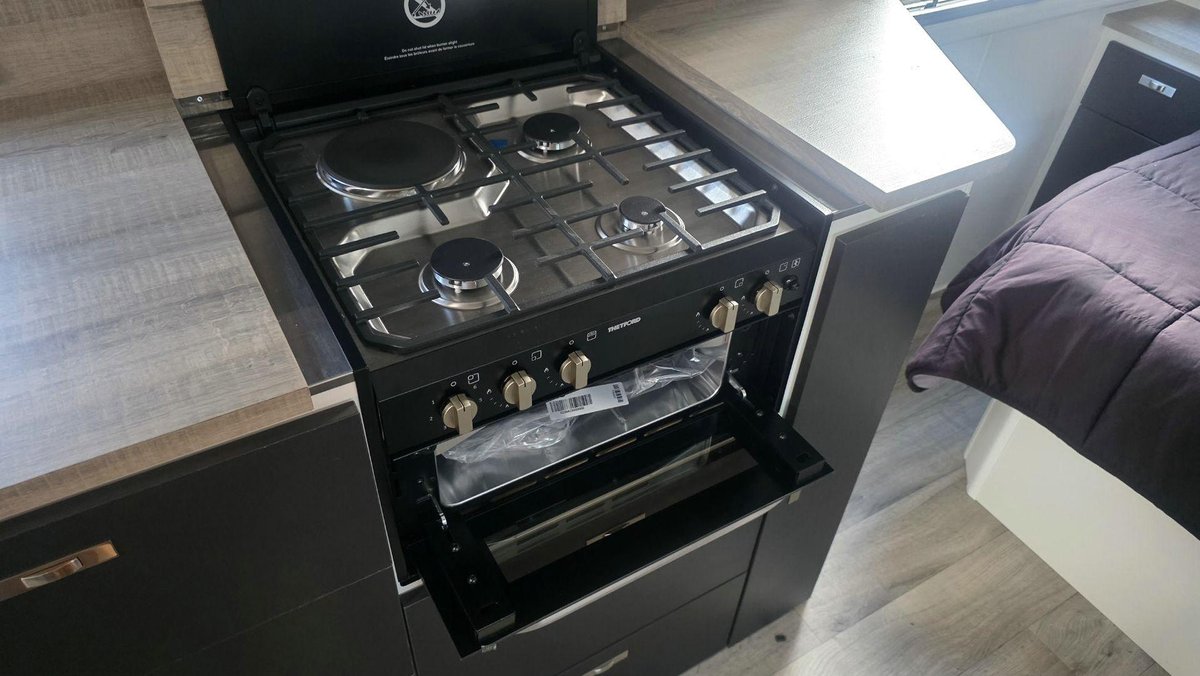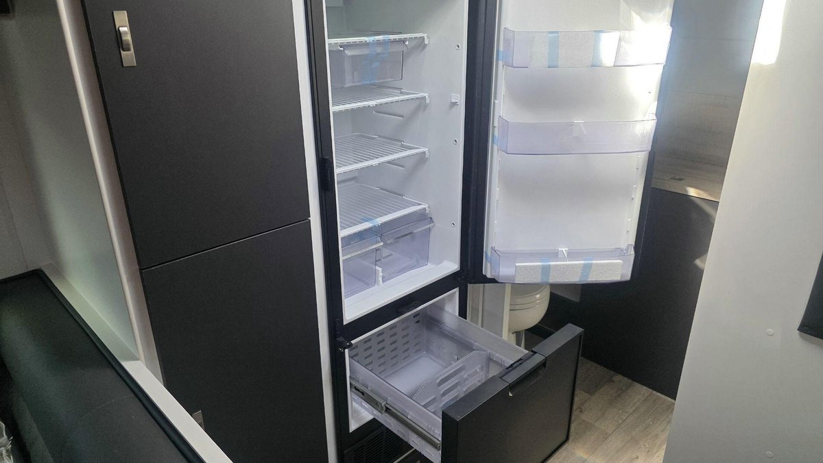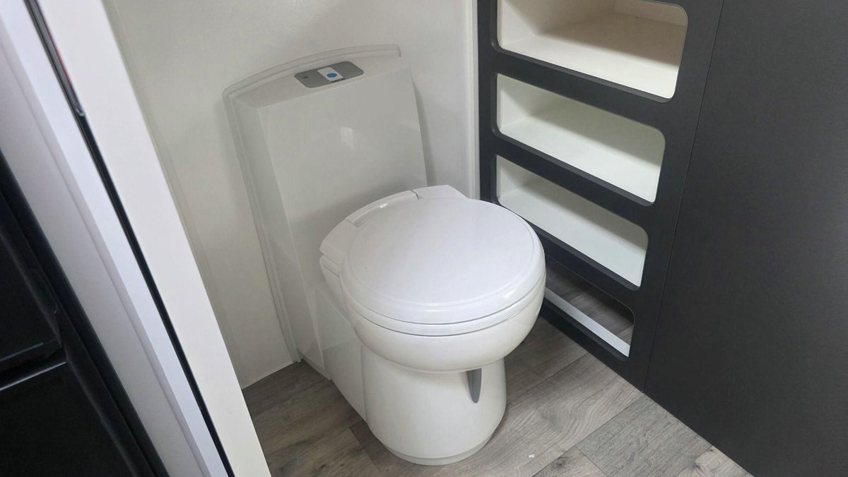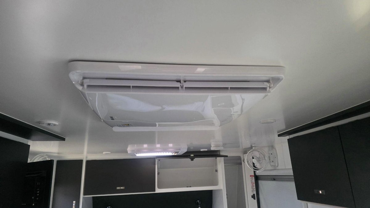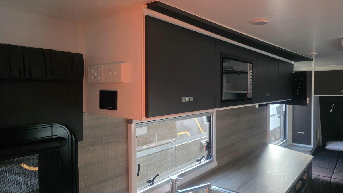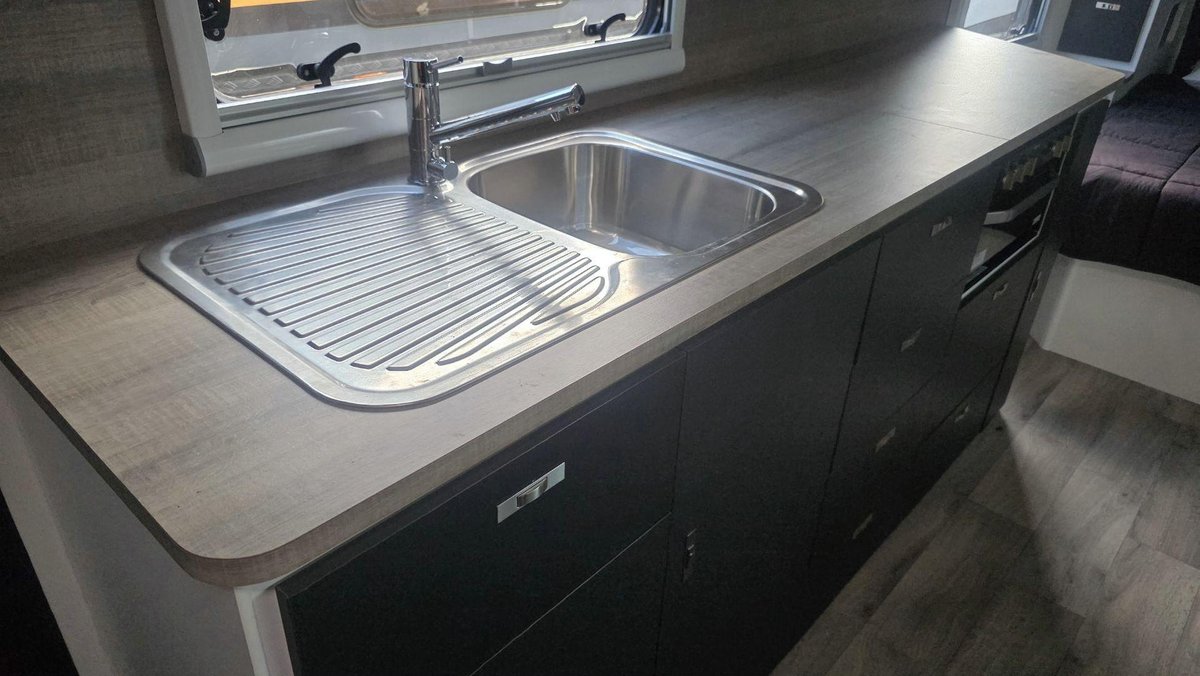Inside, this van offers a bright, modern layout with a full island bed, a café dinette and a complete ensuite featuring a separate shower and toilet. The kitchen includes a large fridge, cooktop, microwave and premium tapware, while reverse-cycle A/C, LED lighting and an entertainment system with TV create a comfortable environment for when you want to unwind. High-end cabinetry, thoughtful storage and a spacious interior design reflect Design RV’s focus on luxury and practicality.