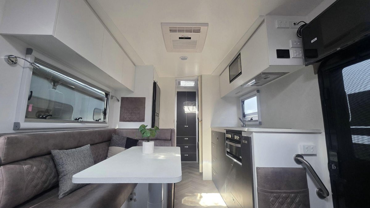 Inside, this van offers a smart, family-friendly layout with a comfortable island bed for parents, well-designed bunks for the kids, and a cosy dining area perfect for meals and downtime. The fully equipped kitchen includes a large fridge, cooktop, microwave and excellent storage to help you keep the whole family fed. The full ensuite features a separate shower and toilet, premium fittings and great ventilation. With LED lighting, modern cabinetry, quality appnces and a bright, open design, this van is built for when you want dependable comfort and easy living for the whole family.