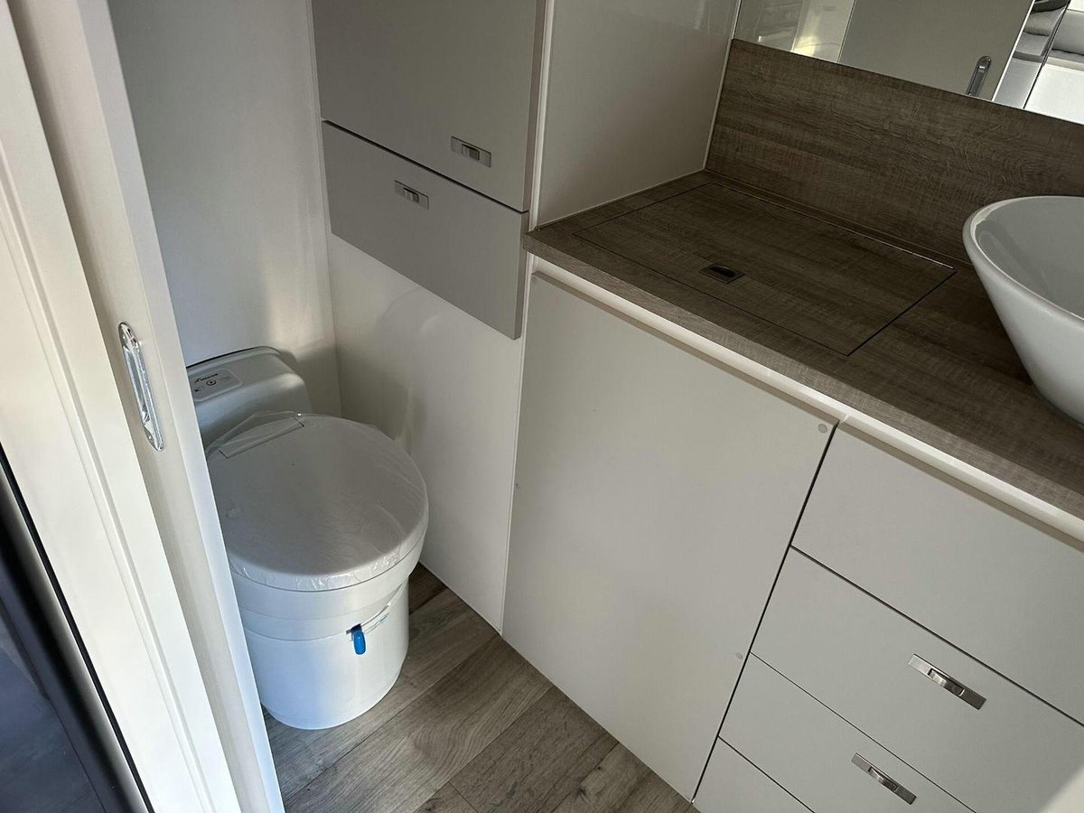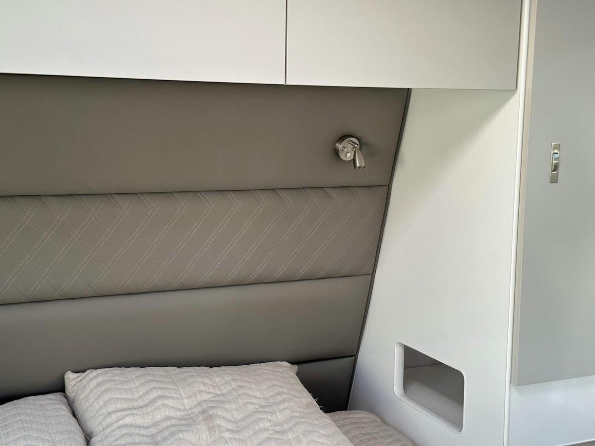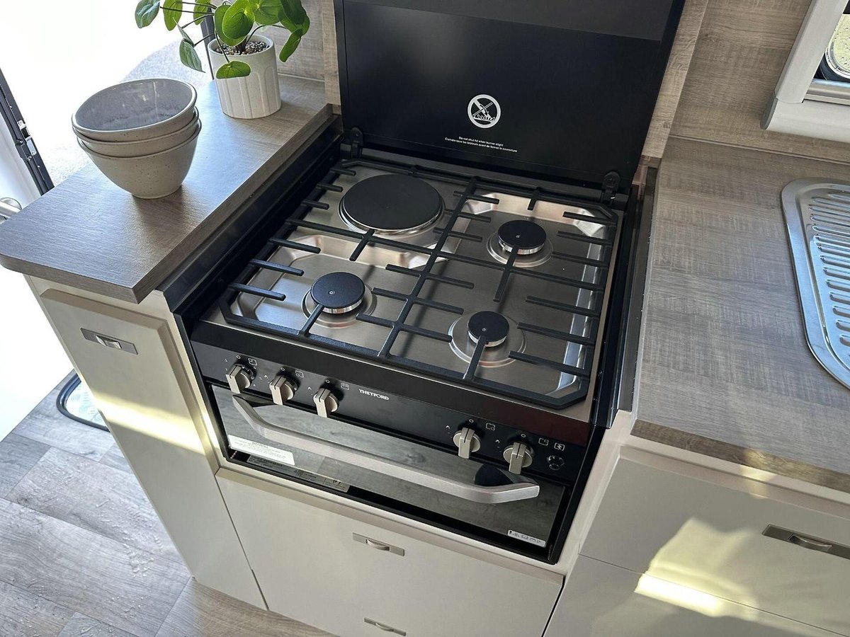Stepping inside the A-Class V1-1, you are greeted by a meticulously designed interior that emphasises comfort and practicality. The caravan boasts a full ensuite with a separate shower, toilet and washing machine, offering convenience and privacy throughout your travels. The interior is enhanced by double-glazed windows with midge screens and block-out blinds so you can sleep in once the holiday starts.