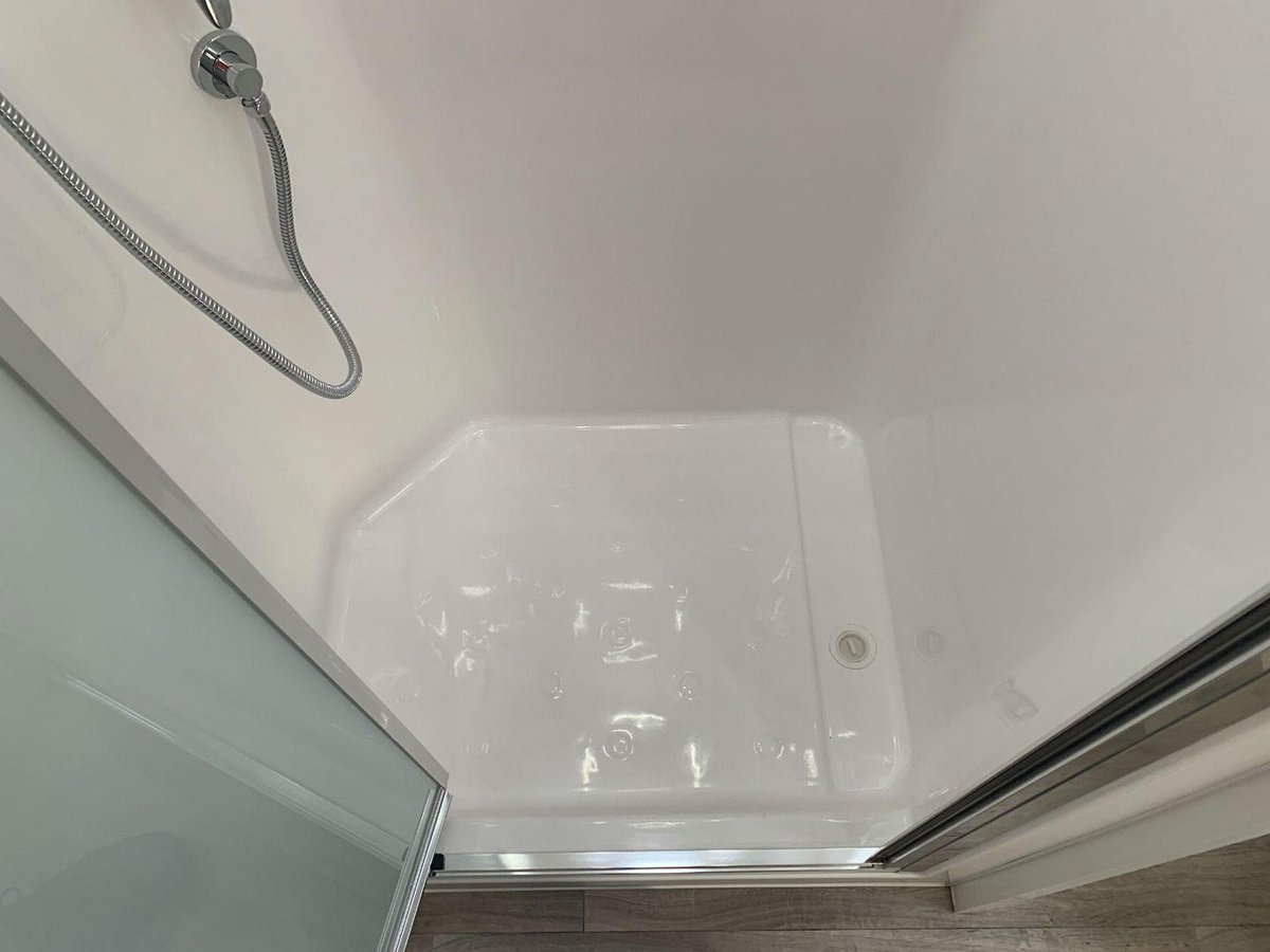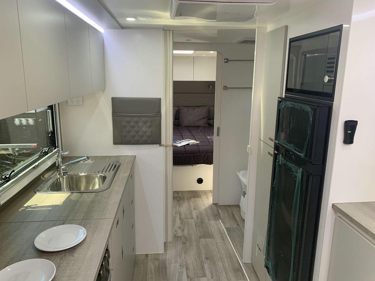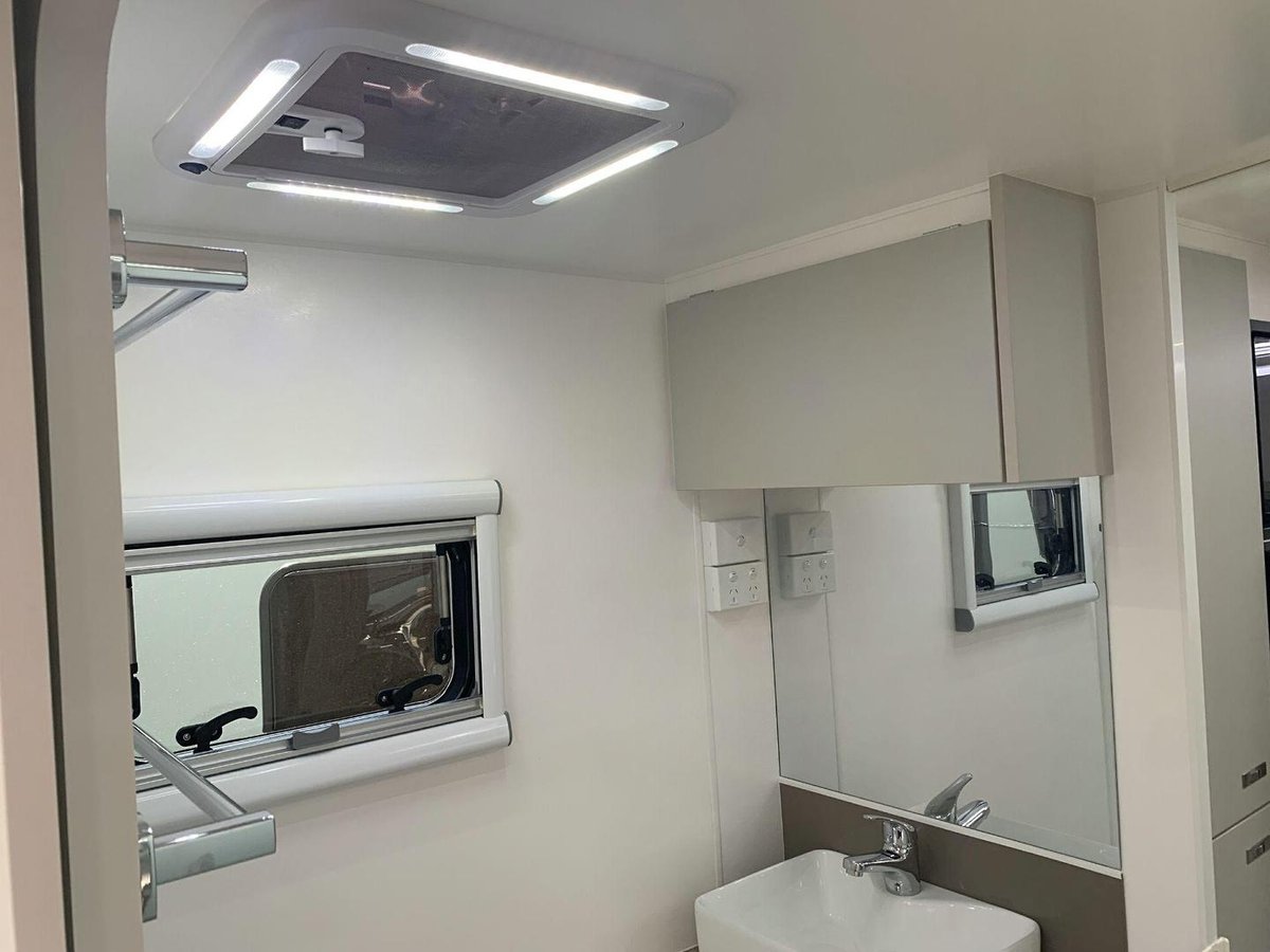 Inside the Cruiser Touring V10, a one-piece poly honeycomb floor, premium vinyl flooring and a generous internal ceiling height create a welcoming and spacious environment. The kitchen caters to all culinary needs with a recessed cooktop, full oven, laminate benchtop, and acrylic splashbacks. The living area’s plush upholstery invite relaxation, while the bedroom guarantees restful nights with its innerspring queen mattress. The caravan’s comprehensive layout also includes a centrally located large ensuite with a separate shower and toilet, ensuring every home comfort is available on the road.
