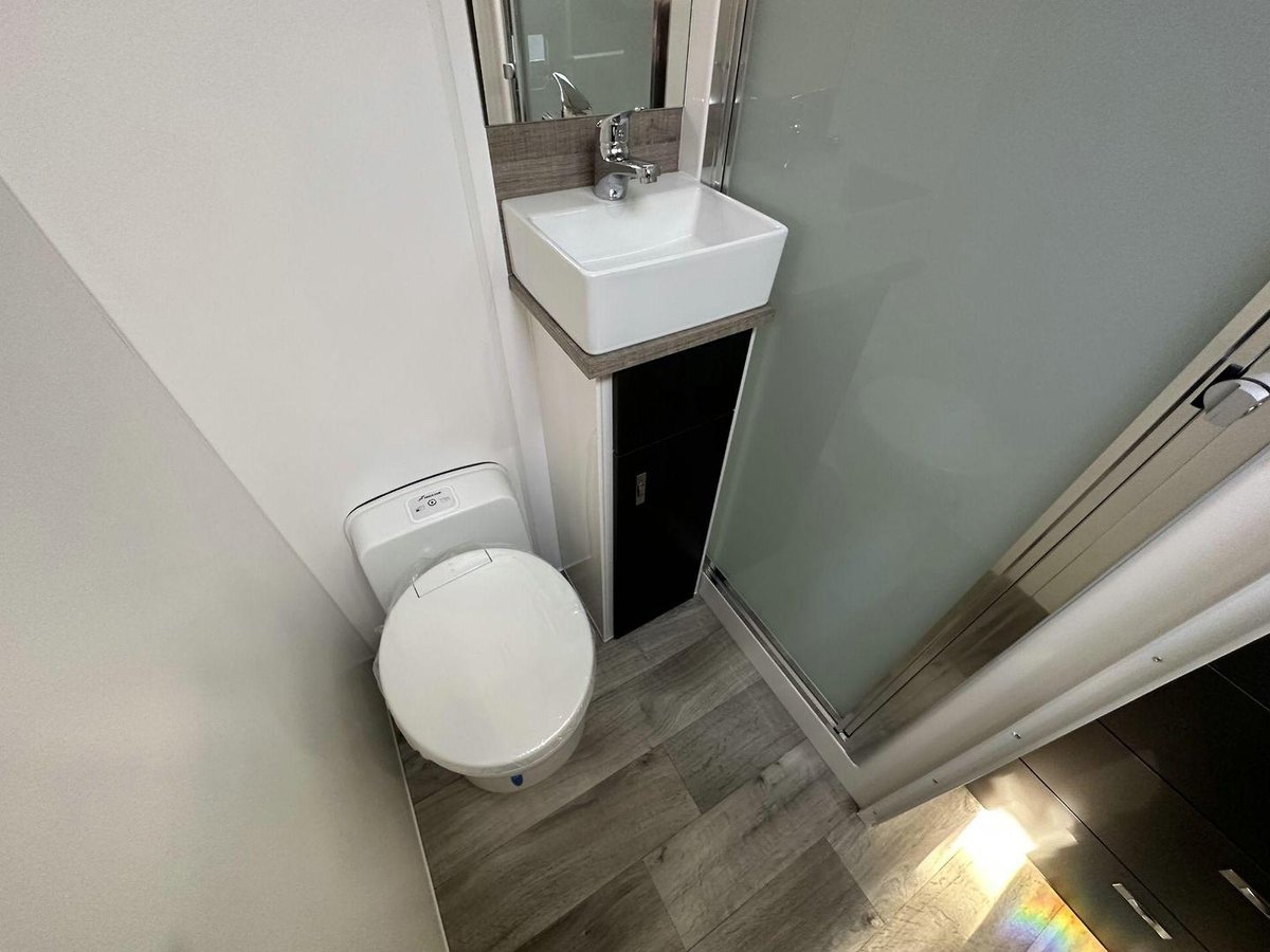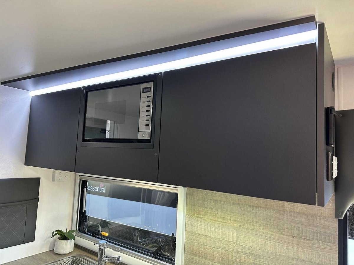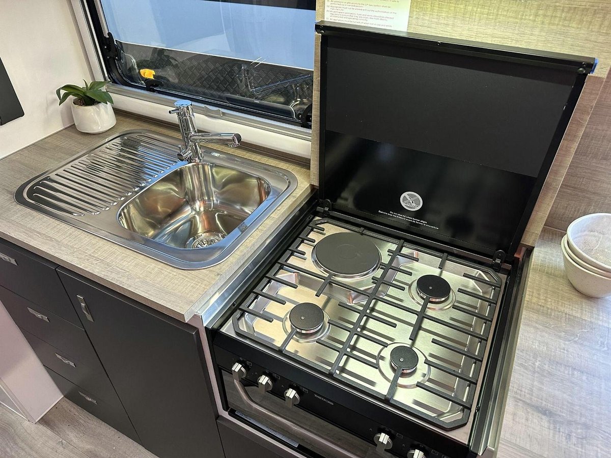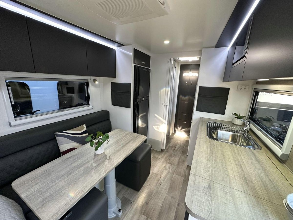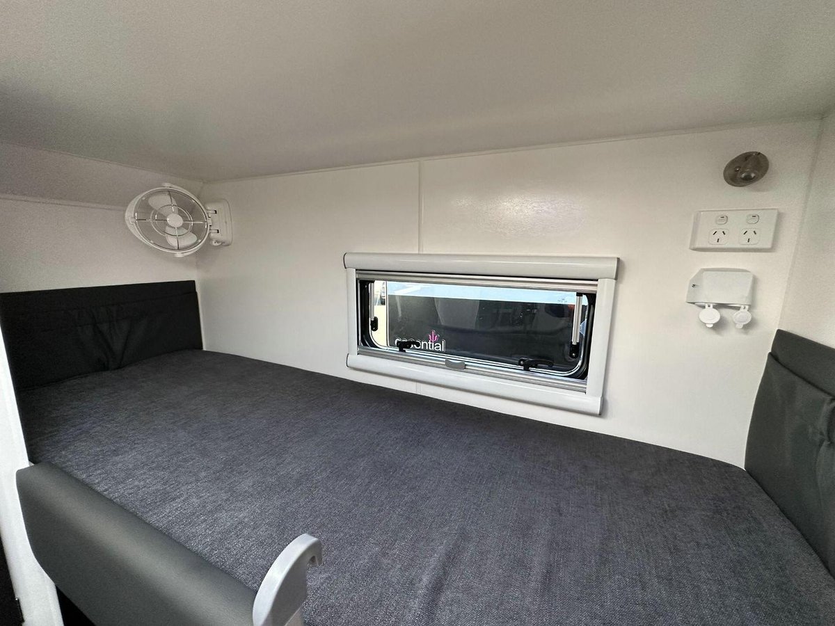 Upon entering the Ranger F1-2, the interior welcomes you with its generous 6’8 internal roof height creating an open, airy feel. The Ranger F1-2 features advanced entertainment options such as a 24" flatscreen TV and a stereo system, perfect for keeping everyone entertained. Comfort and convenience are further enhanced with a north-south island queen bed fitted with an innerspring mattress, and integrated wardrobes with built-in 240V and USB power points.