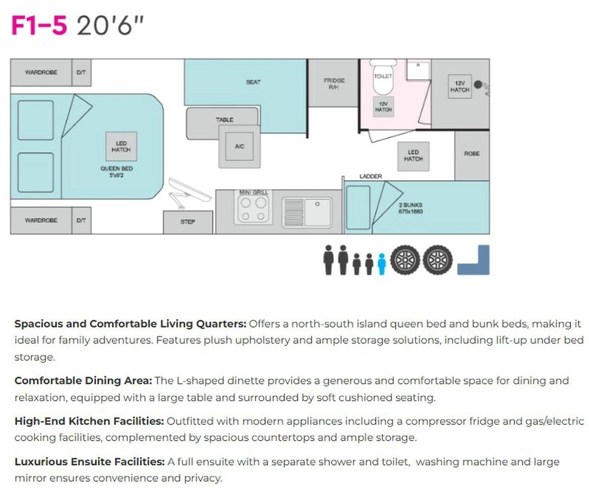 The Ranger F1-2 is a superbly designed semi off-road caravan with bunks, tailored for families who enjoy the rugged outdoors without sacrificing the comforts of home. This dual axle model is built to navigate less traveled paths while providing a stable and luxurious living environment.