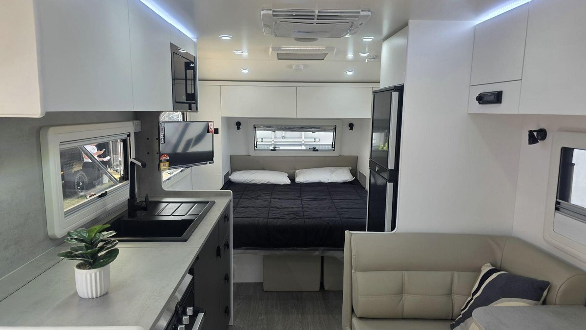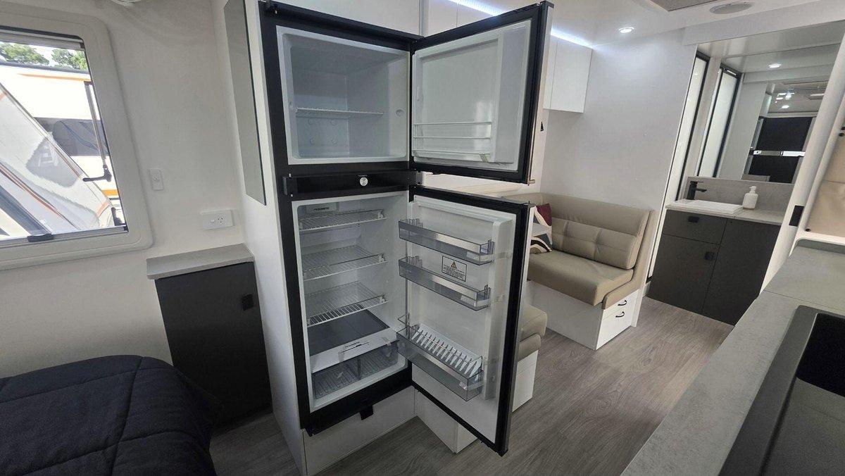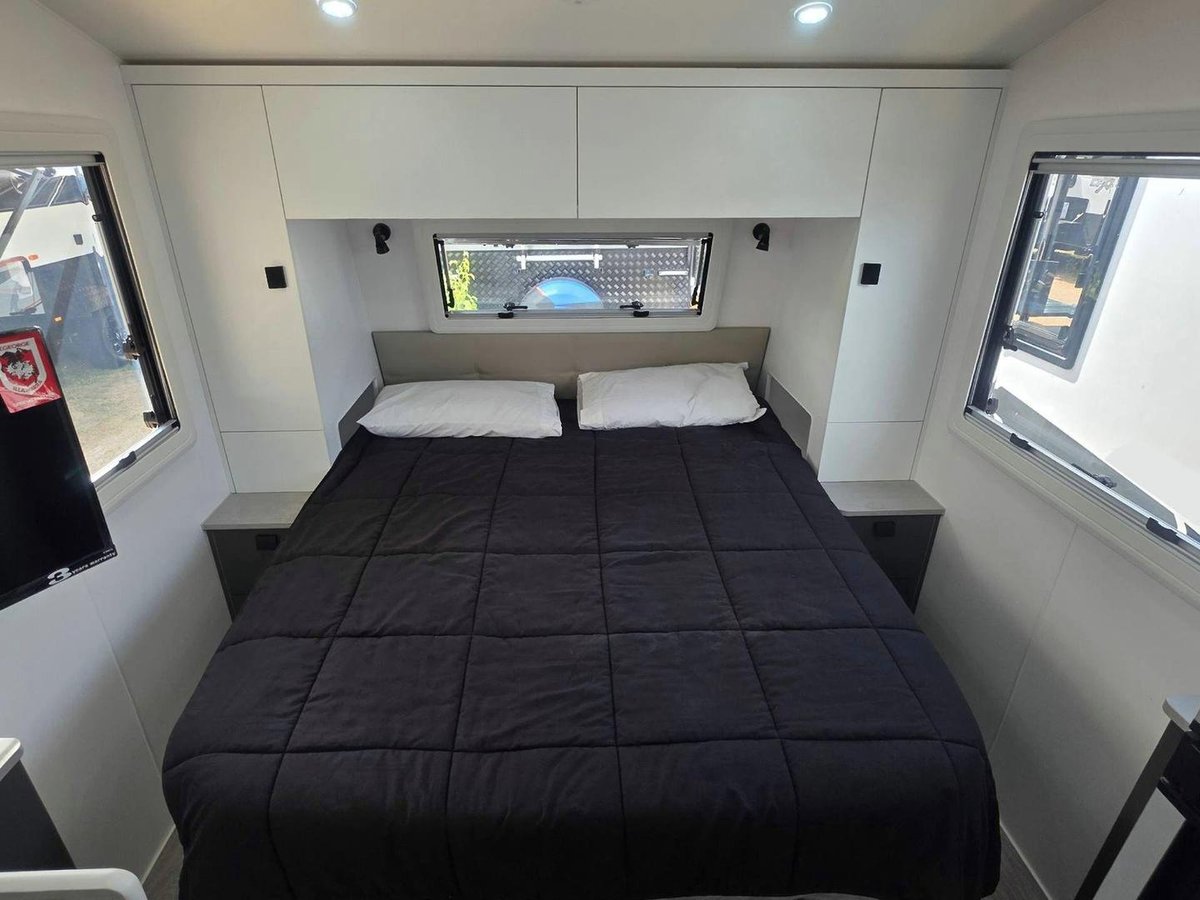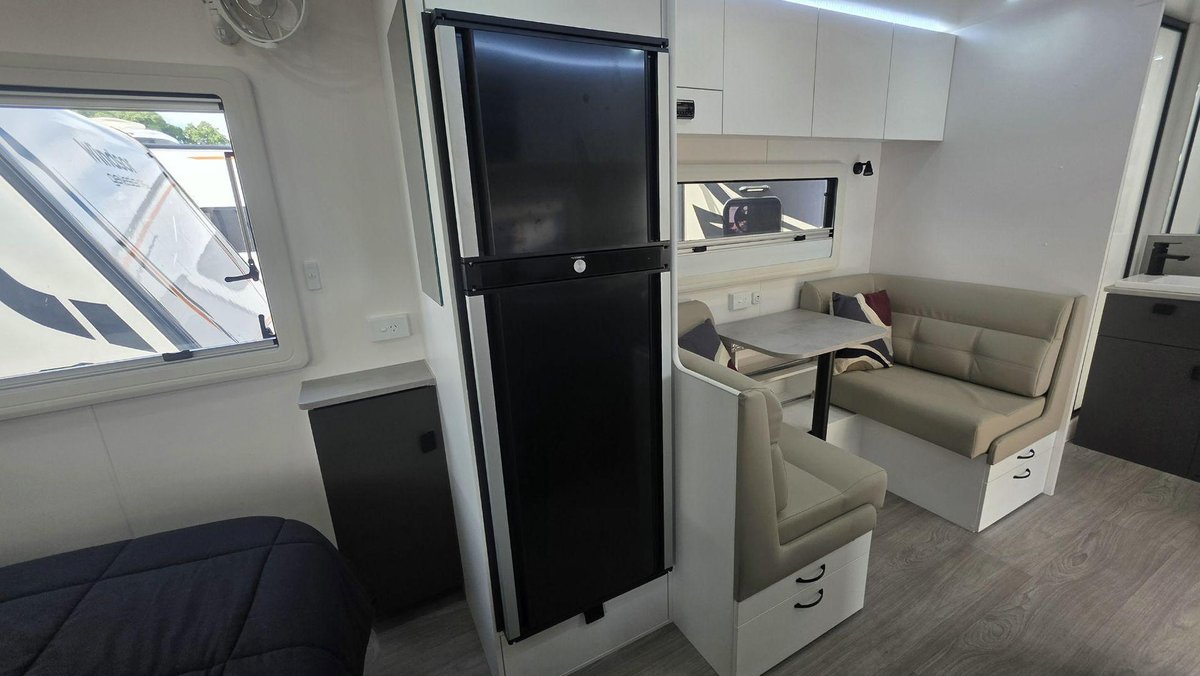 Smart Layout, Premium Features and a Comfortable, Bright InteriorThis van offers a well-designed interior featuring a comfortable island bed, a stylish dinette and a fully equipped kitchen with a large fridge, cooktop, microwave and great storage that makes your kitchen space feel like a home away from home. The washing machin and efull ensuite - with a separate shower and toilet—adds privacy and convenience, while the dual-axle design ensures smooth, stable towing experience. With premium cabinetry, LED lighting, excellent insulation and modern finishes throughout, this van is built for when you want comfort, rebility and relaxed living in one complete package.