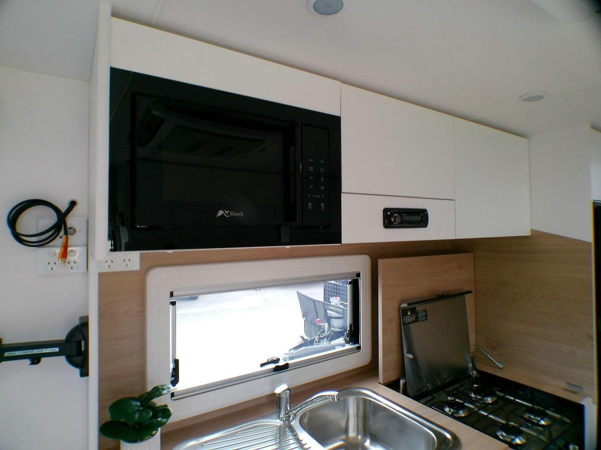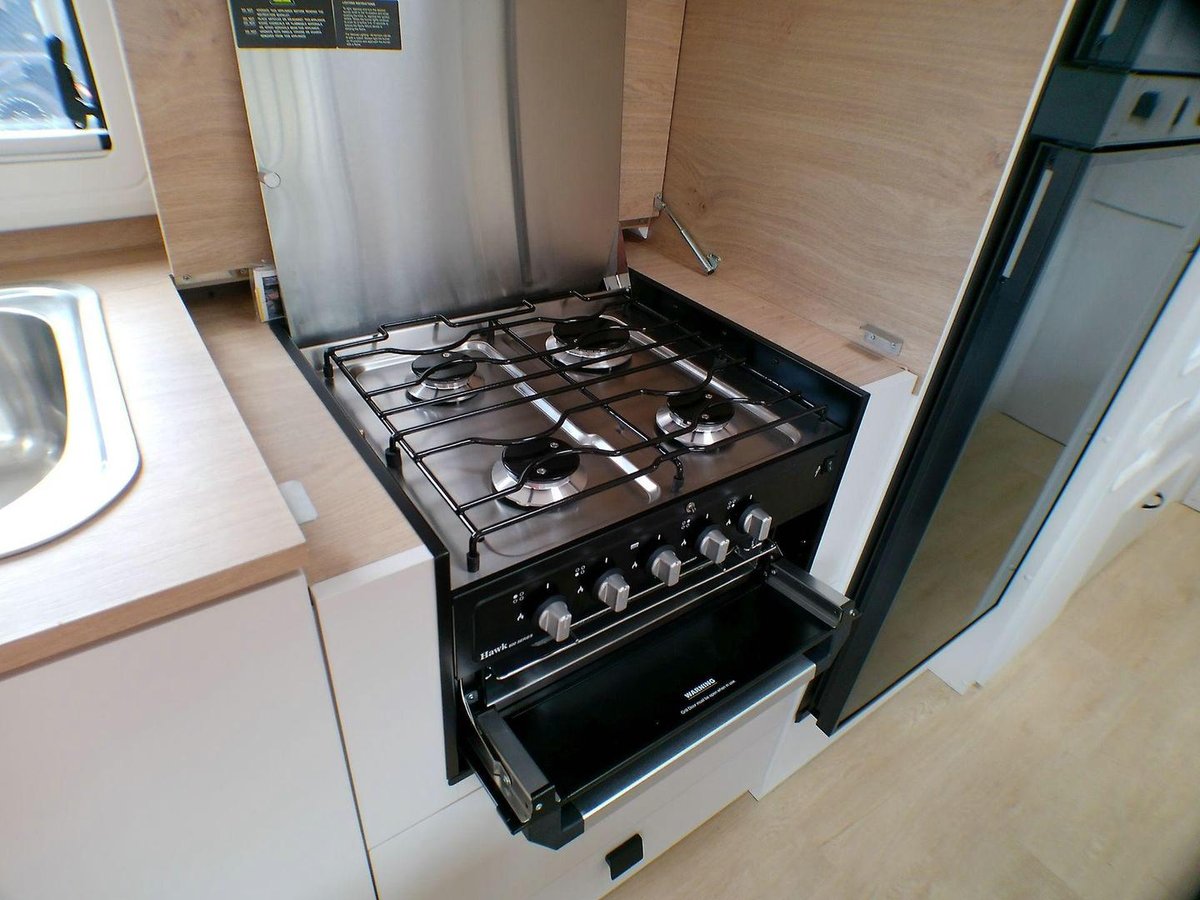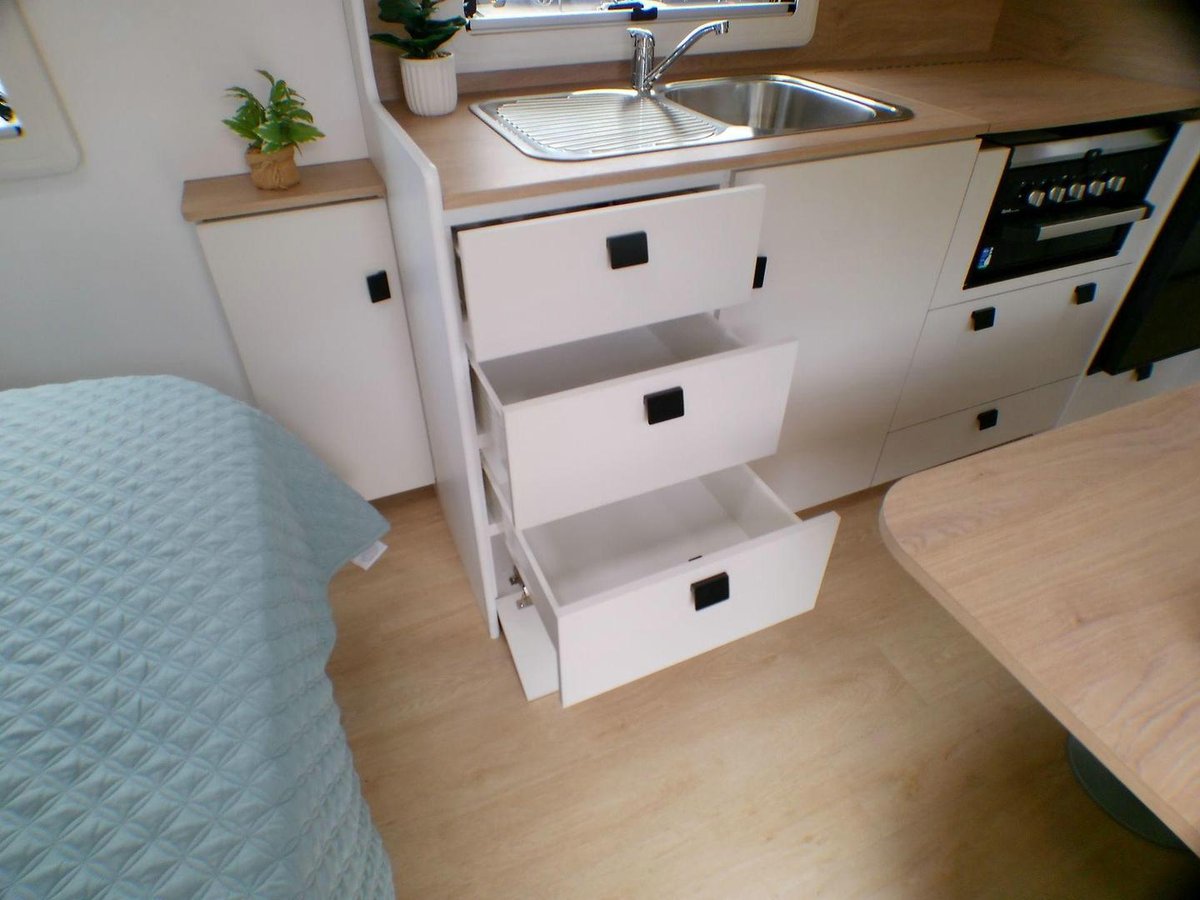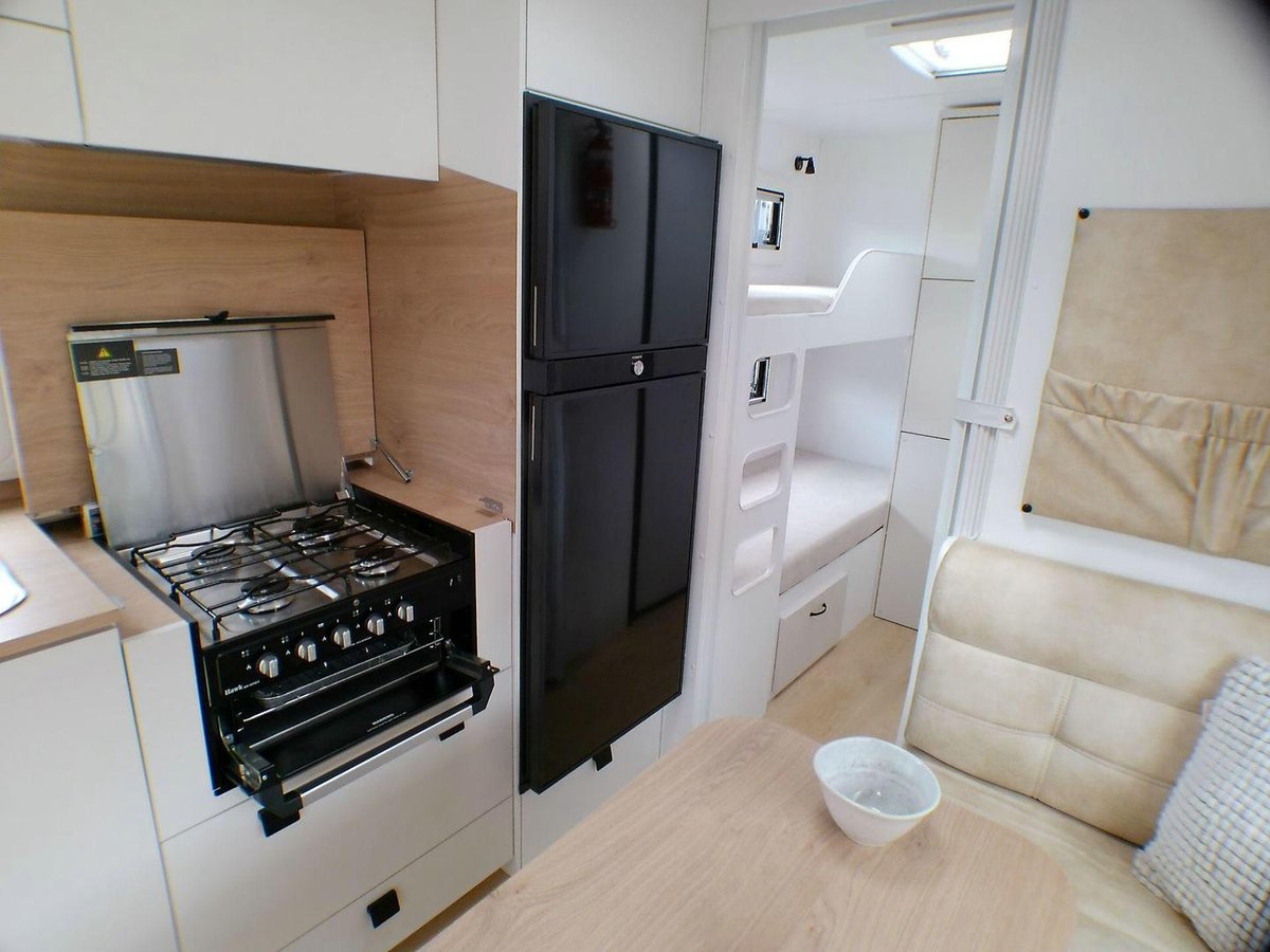 Queen island bed: Full innerspring mattress with walk-around access and under-bed storage Two dedicated bunks: Comfortable sleeping for kids with smart use of space L-shape lounge: Ideal for meals, schoolwork, games, or relaxing Premium cabinetry: Itan hardware and high-quality finishes throughout Tall 6'8 ceiling: Enhances comfort and interior spaciousness Fully Equipped Kitchen Designed for real family cooking, the kitchen includes everything you need for life on the road.
