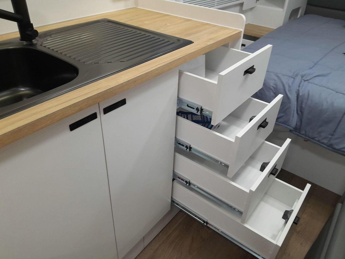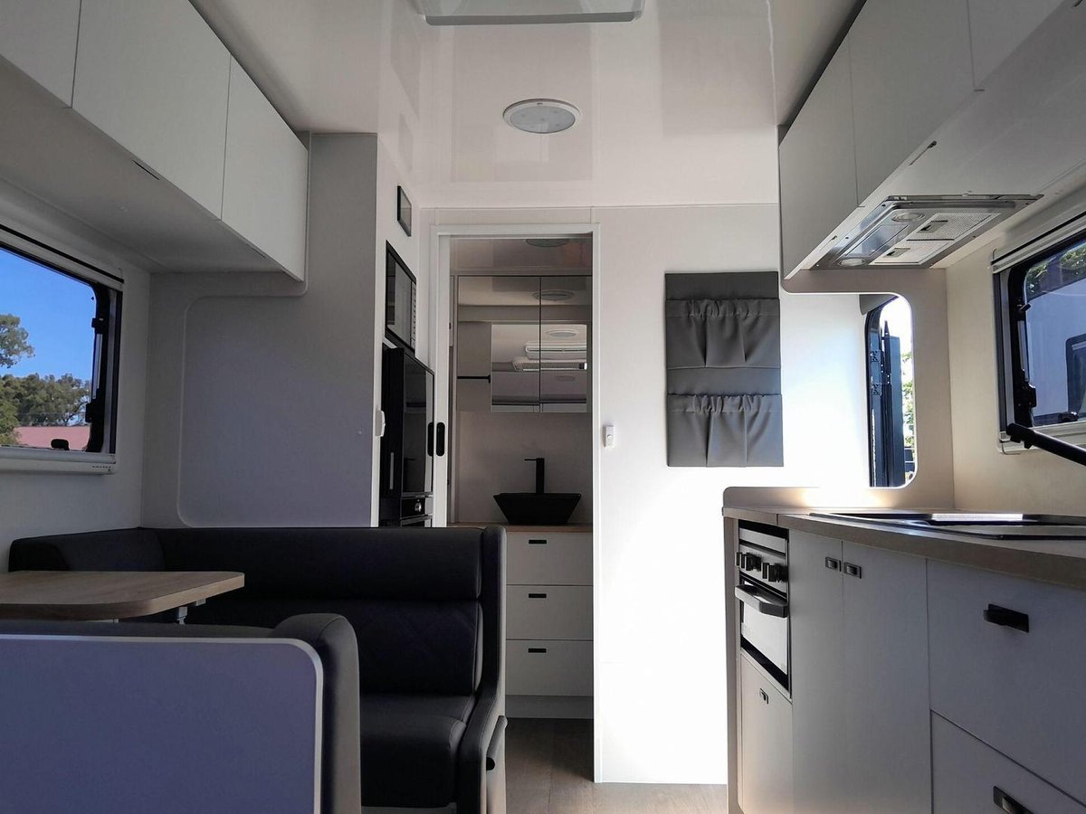 The 1860 Adventure CP is built on a heavy-duty off-road chassis with independent suspension, all-terrain tyres, and a dual-axle platform that delivers outstanding stability and control on rough tracks and long highways alike. Inside, you’re welcomed by Goldstream’s signature craftsmanship — a beautifully finished interior featuring a queen island bed, a rear ensuite, and a spacious rear-dining layout that offers exceptional comfort and versatility. The kitchen is fully equipped with a grill, cooktop, microwave, and large fridge, giving you everything you need for real cooking on the road. Premium cabinetry, plush seating, LED lighting, generous storage, and high-quality fittings complete the package, making this van feel like a true home away from home. With strong off-grid capability, the Adventure CP is ready for extended touring wherever you choose to roam.