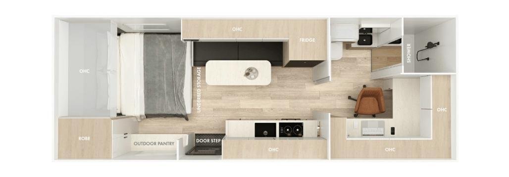 We have cool, modern, and unique caravans available in Australia: QLD (Queensland), NSW (New South Wales), SA (South Australia), WA (Western Australia), and VIC (Victoria). Our available sizes are: 18ft, 19ft, 20ft, 21ft, and 22ft. We have 2 berth, 3 berth, 4 berth, 5 berth. Enquire for floor plans of each stock.