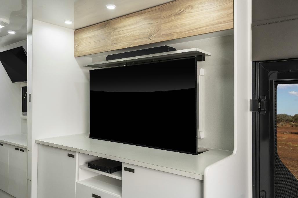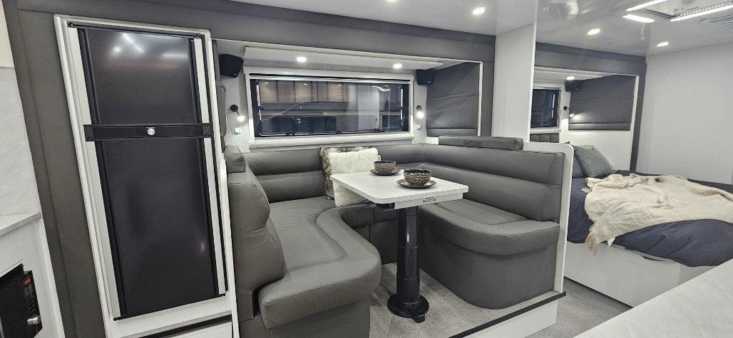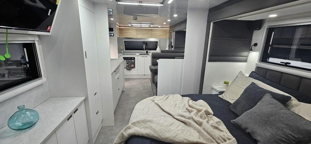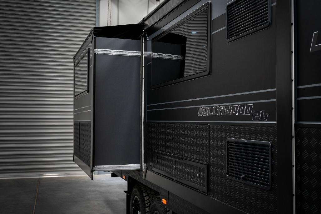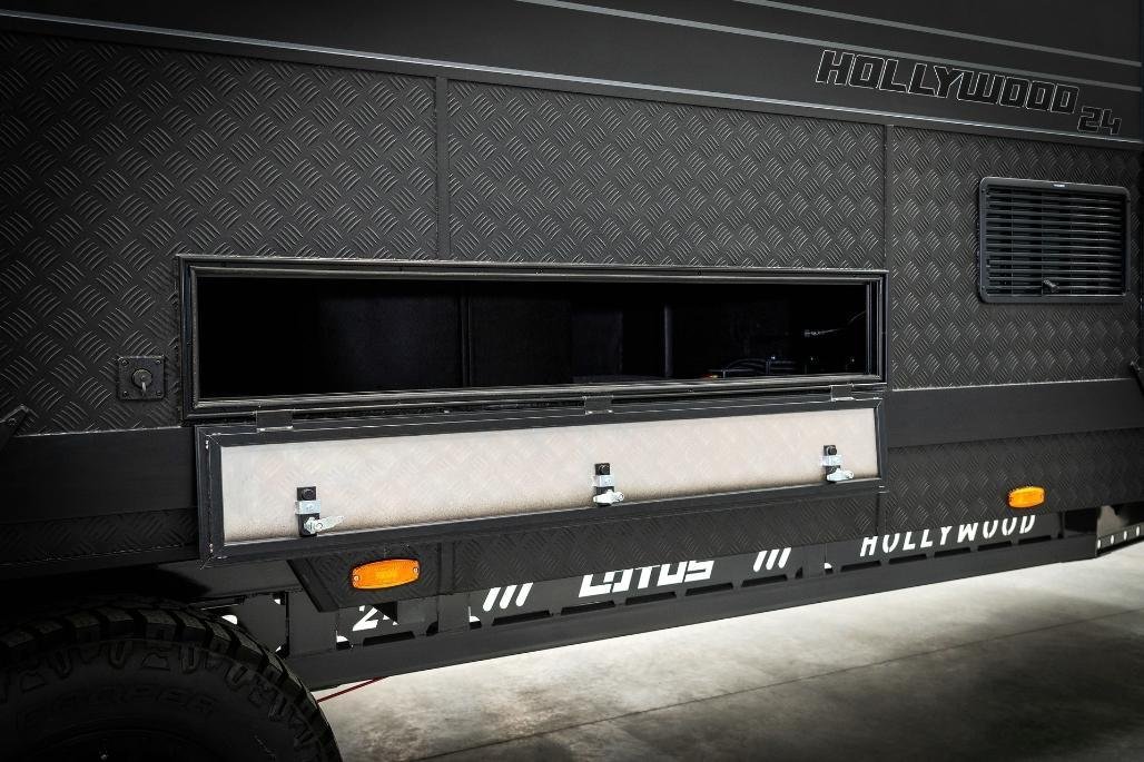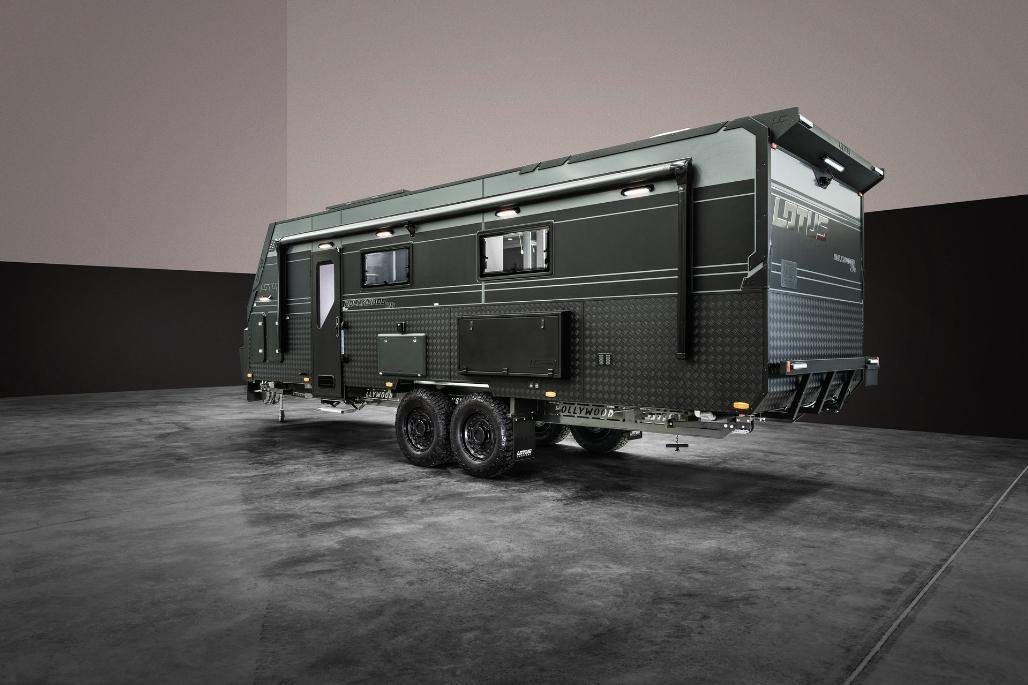 Step inside to discover an expansive living area with Italian leather upholstery, multiple TVs, and premium finishes throughout. Indulge in the spacious bathroom and fully equipped kitchen, where every detail exudes extravagance. Built on a robust truss chassis with Torflex independent suspension and all-terrain tyres, the Hollywood glides effortlessly from the city streets to scenic beachfronts. With customisable features and high-end electrical systems including lithium batteries and solar power, the Hollywood sets a new standard in refined and reliable luxury.
