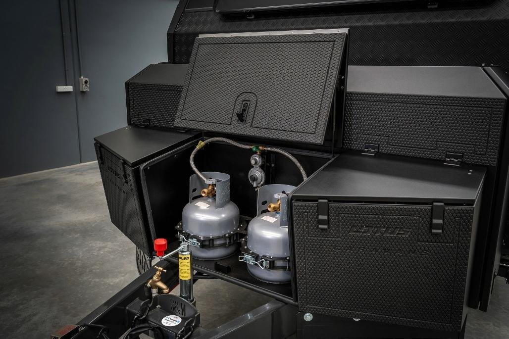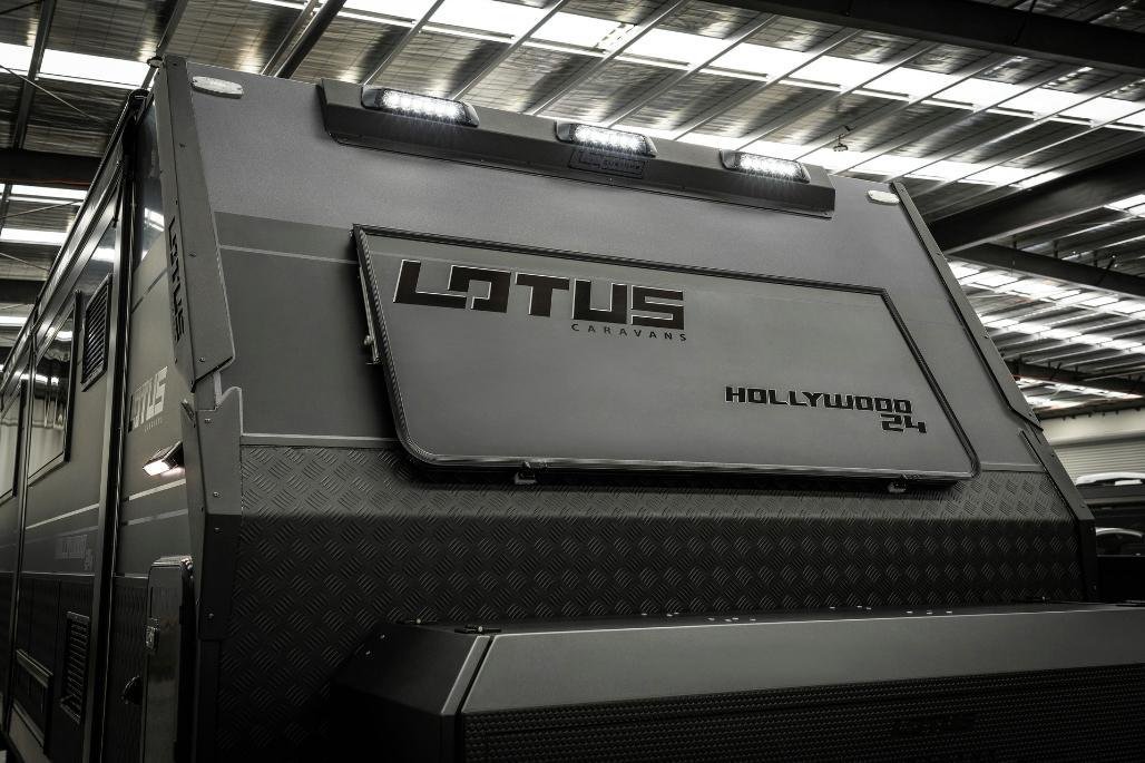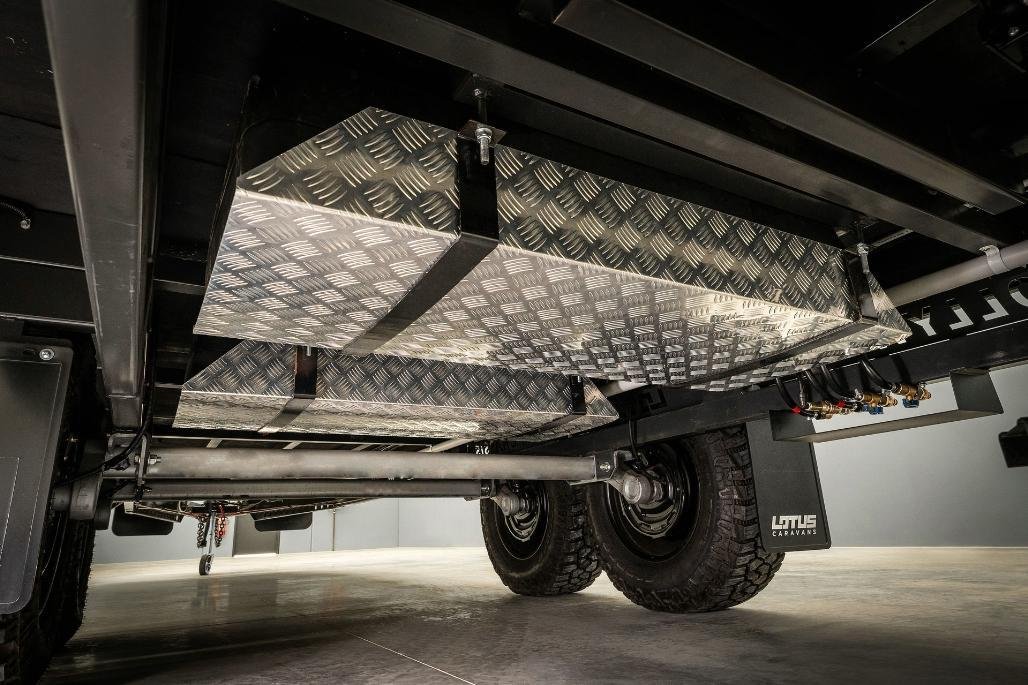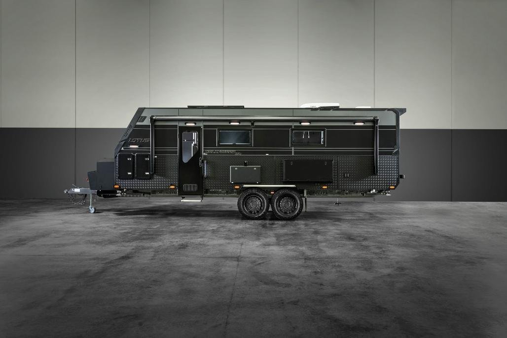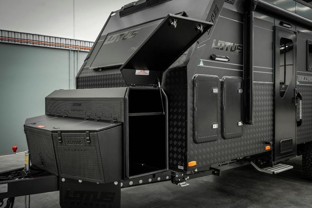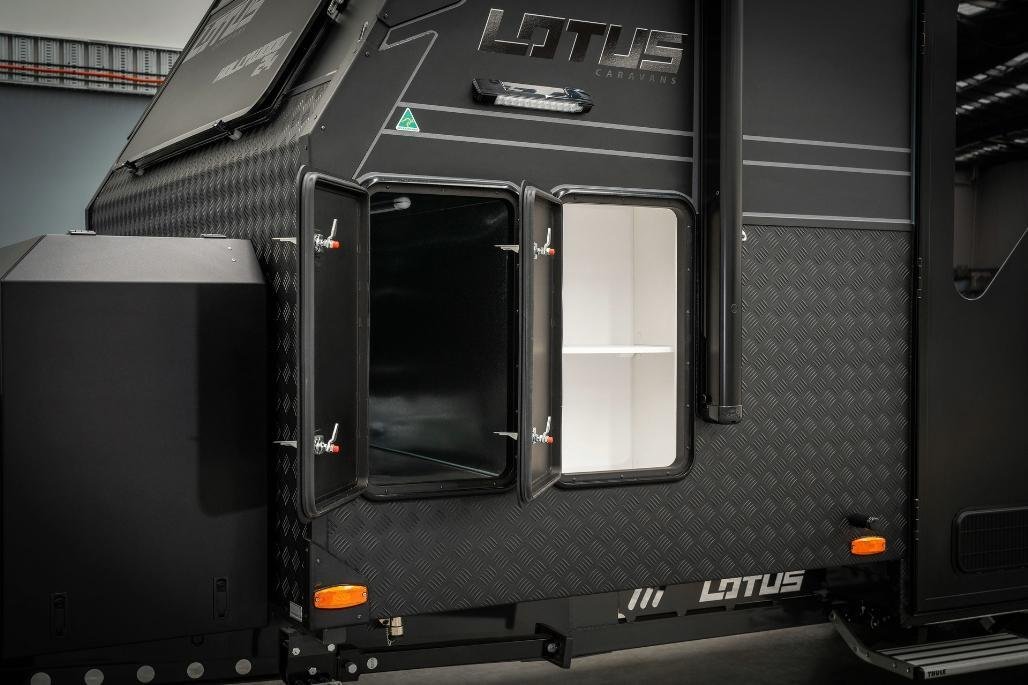 X GUARD BUMPER AND ACCESSORIESLC STYLING PACKLC DRAG WINGEXTRA WORK LIGHT SMALLLC CUSTOMES TOOLBOXLC FRONT LIGHT BAR PLANELDESIGNER HARDWARESIGNATURE VINYL FLOOR UPGRADELC PREMIUM ET PACKinternal• Slide out lounge & bedroom• Hybrid Frame: Aluminium front, back & roof with the industry’s strongest timber wall construction• Stylish, modern furniture with Lotus Caravans unique interlocking cabinetry• Premium range of matte & gloss laminate benchtops• Contemporary sinks, taps & hardware packs• Residential grade soft close drawers with solid side support• Toughened residential grade hinge assembly• European-made vinyl floor• Premium Italian leather lounge seating• Structural grade one-piece timber floor base• Mesh & block-out blinds• Uniquely designed ergonomic floorplanchassis• Torflex independent suspension• Lotus Caravans exclusive truss chassis – built by S&M Chassis• Supergal charcoal chassis• DO45 Coupling & heavy duty chains• 12" brakes• Premium 34 Discoverer Rugged Trek Tyres• Custom 18" Lotus Caravans stealth wheels• Drop-down stabiliser jacks• Galvanised bumper bar• Electric aluminium entry step• Break-away strap• 6" A-frame• 60mm clamp on A-frameappliances• 188L 12V compressor fridge• Fusion ultimate sound package:o Fusion Apollo 770 Systemo AM/FM/Bluetooth/USB/ Wi-Fio DAB+ Readyo Fusion corner speakers in bedroom and loungeo Fusion external sound panelo Dual remote controls fitted• Euro-style front/top load washing machine• Reverse cycle air-con & heating unit• Full-size o