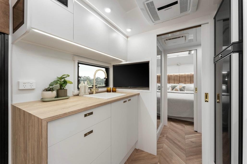 Stylish, modern furniture with Lotus Caravans unique interlocking cabinetry