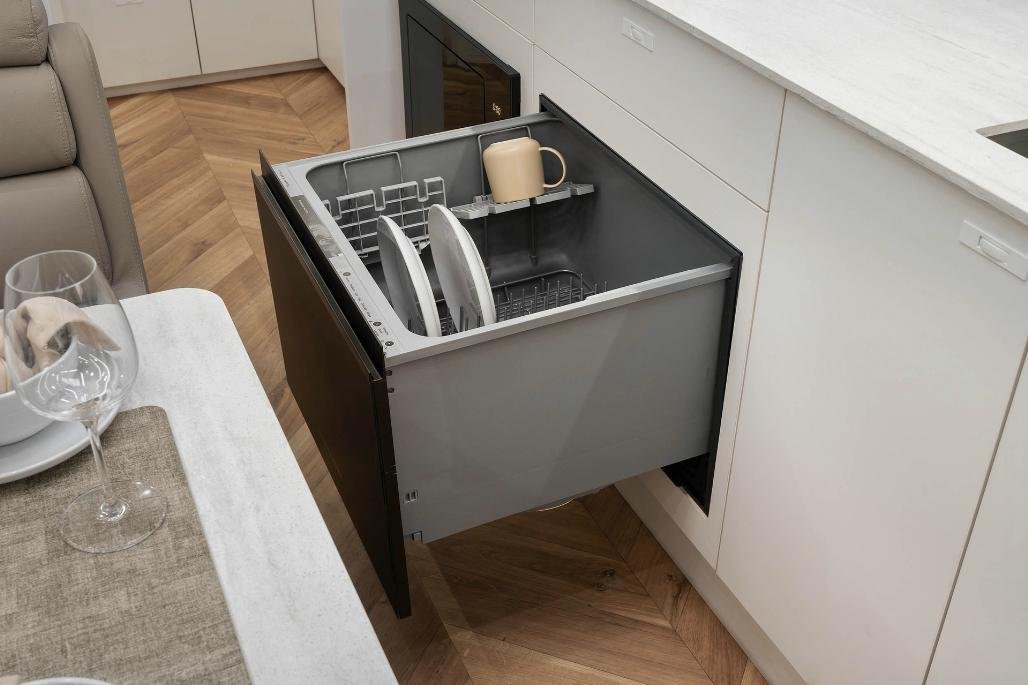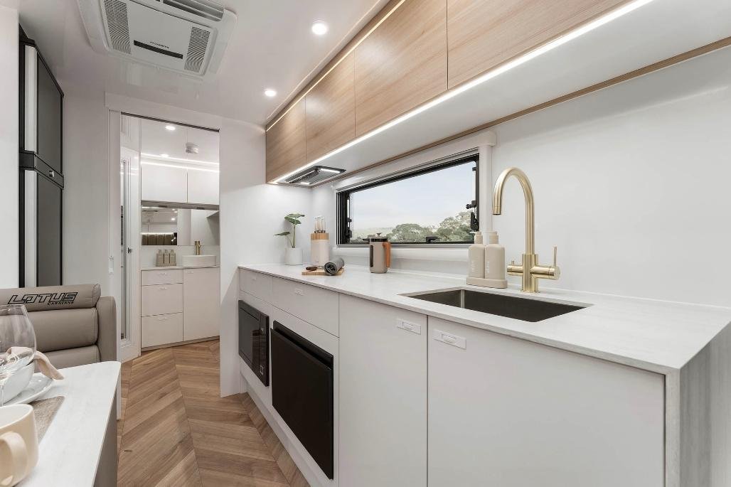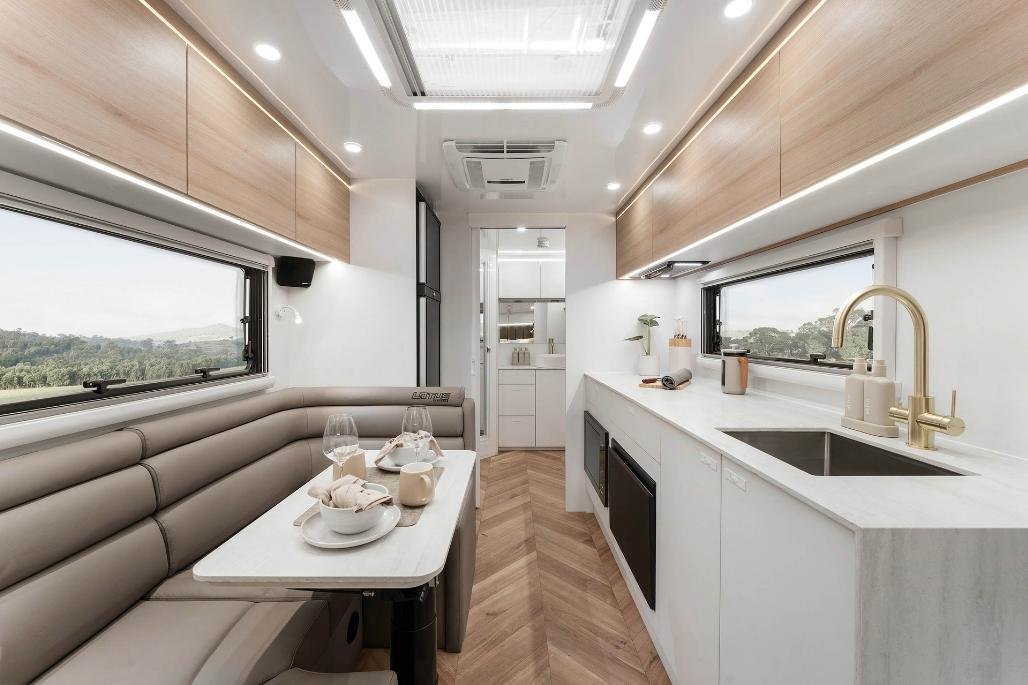 Stylish, modern furniture with Lotus Caravans unique interlocking cabinetry