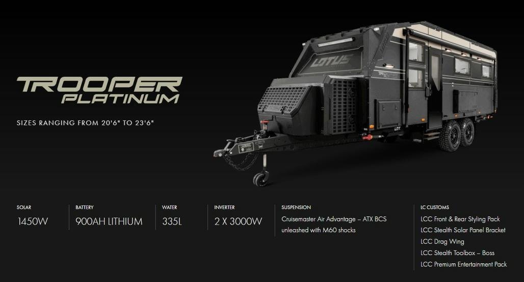 The Trooper Platinum takes everything Lotus Caravans is known for and turns it up another gear. Every component, every system, every finish has been chosen for travellers who want the finest caravan ever built for Australian conditions.