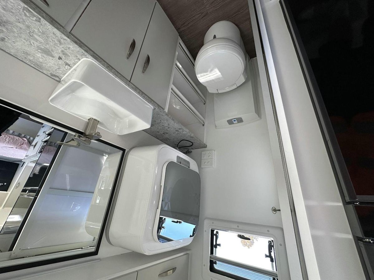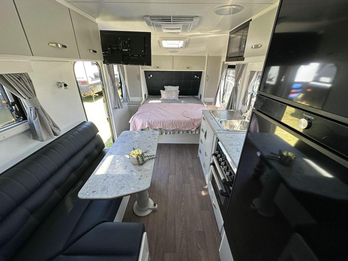 Just because you might be following the road less travelled doesn't mean you have to give up on the creature comforts of home. This caravan is equipped with a full oven, ceramic swivelling toilet, double door fridge, microwave, reverse cycle air conditioner, washing machine (layout dependent), and an innerspring mattress.