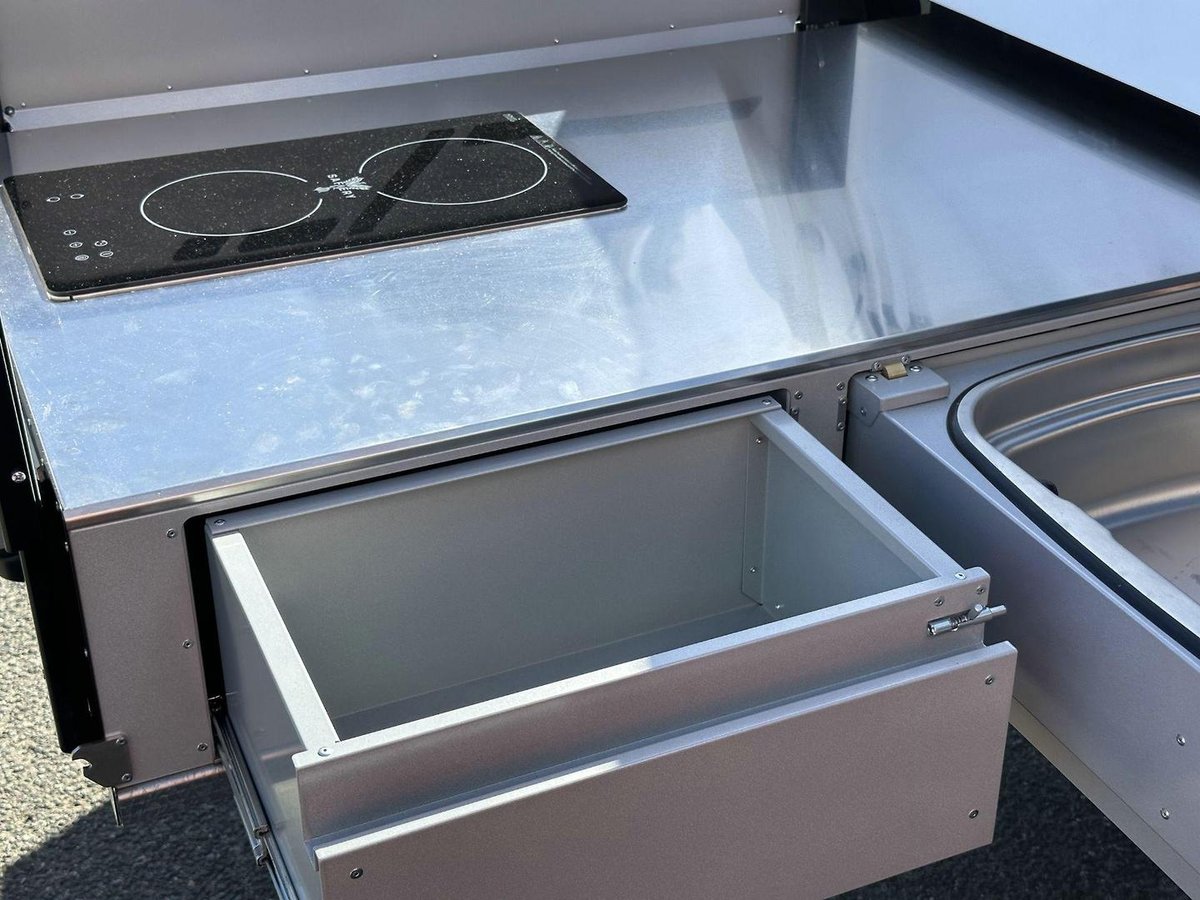 The Lightning features a high output 2 hob induction cooker seamlessly integrated into the Tvan premium kitchen, offering vastly better performance in poor weather conditions (wind etc.).