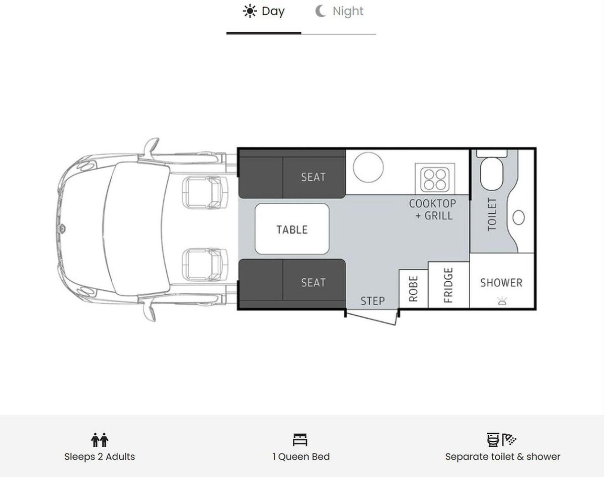 Horsepower: 150hp Engine Make: Renault Master Engine: 2.3 L, 4 cylinder turbocharged Fuel Capacity: 100 L Fuel Type: Diesel License Type: Standard car license Seats: 2 Sleeps: 2 Bed Layout: Queen bed descends from the ceiling