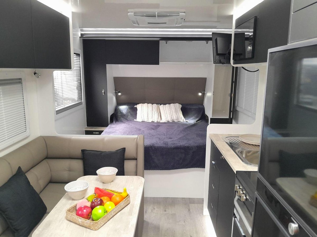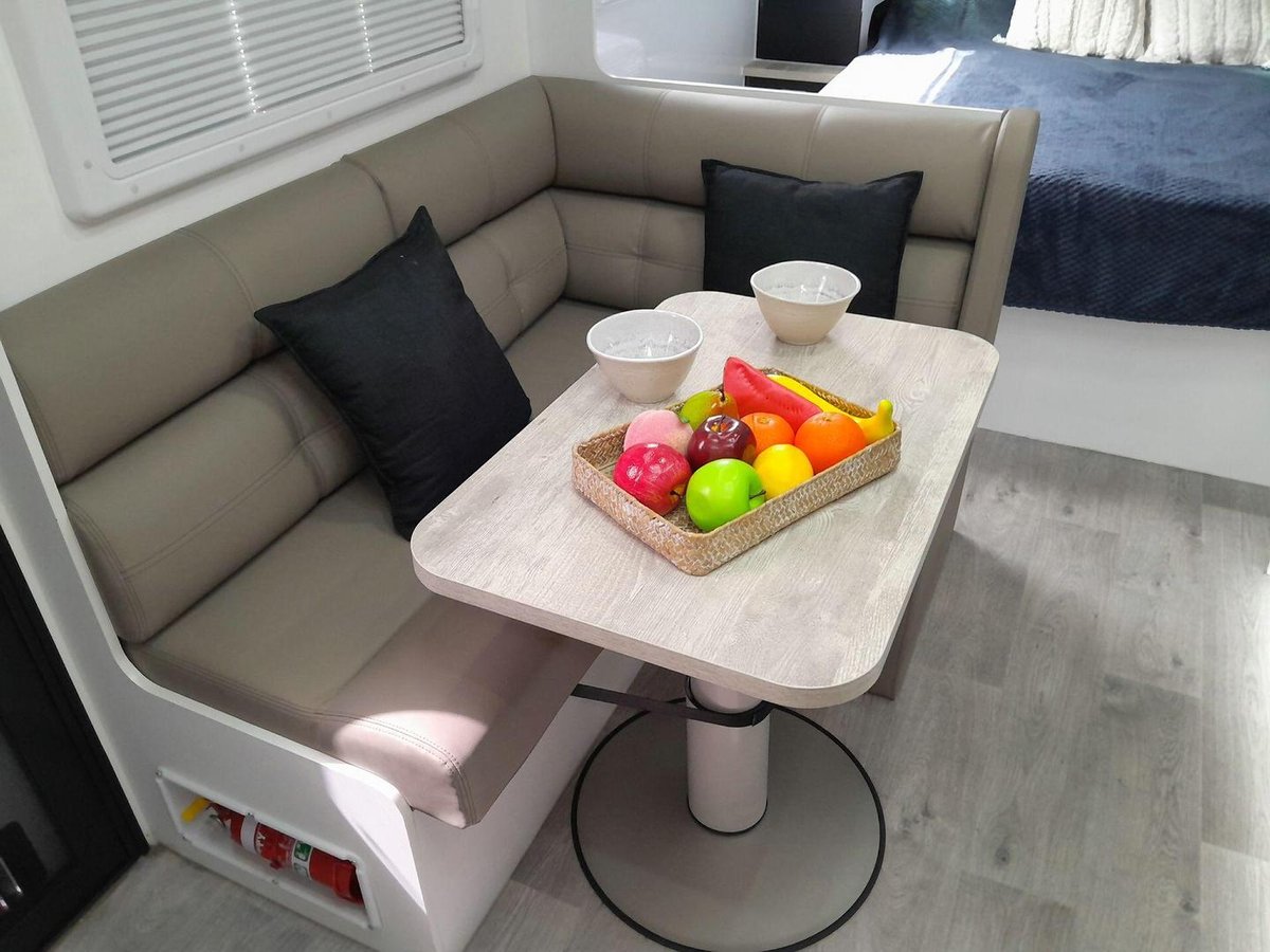 Inside, the 176 RD offers a thoughtfully designed rear-dining layout that creates a spacious, light-filled living area — perfect for relaxing, reading, or enjoying meals on the road. The queen island bed provides a comfortable retreat, and the full ensuite gives you the convenience of your own shower and toilet wherever you travel. The kitchen is well equipped with a large fridge, cooktop, microwave, and generous storage, making it easy to prepare meals on the go. Double-glazed windows, reverse-cycle air conditioning, LED lighting, and durable cabinetry elevate the comfort level, while the strong chassis, roll-out awning, and tunnel boot storage make this caravan ready for touring.