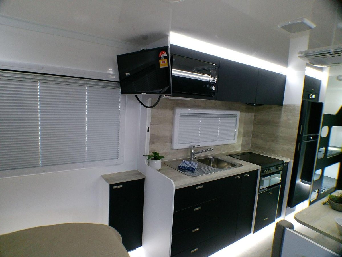3-gas + 1-electric cooktop & grill Microwave oven Large fridge/freezer: Big enough for family food storage Generous bench space: Ideal for preparing meals for hungry kids Family Comforts That Make a Difference From the full ensuite to the washing machine, this caravan is designed to make family travel easier and more enjoyable.