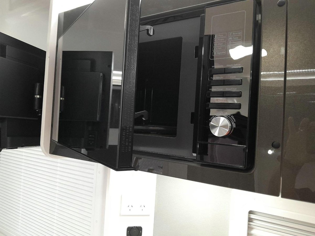 Fully appointed kitchen with fridge, stove, microwave, and washing machine