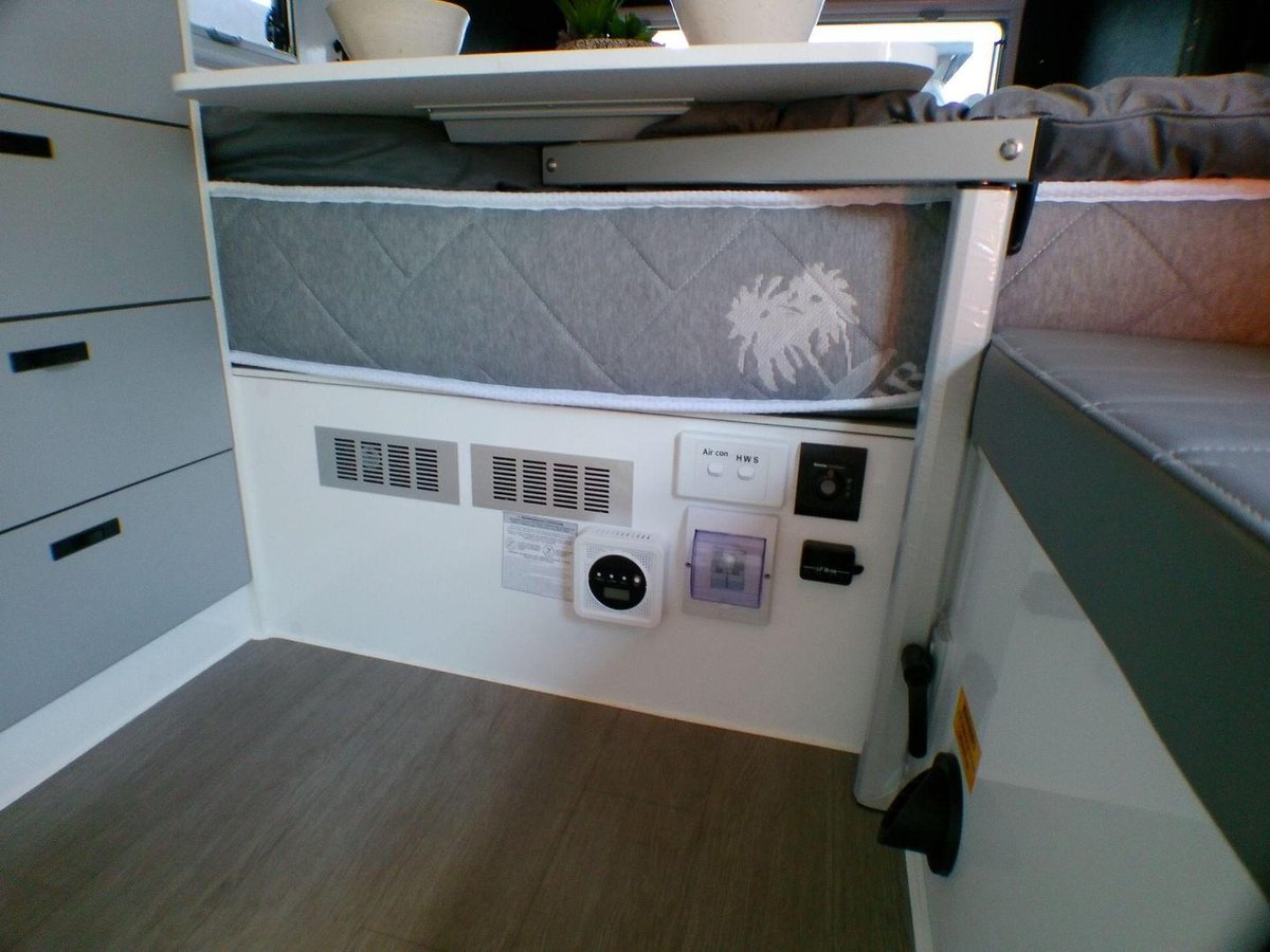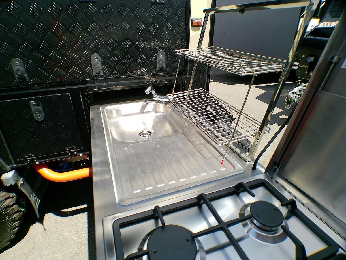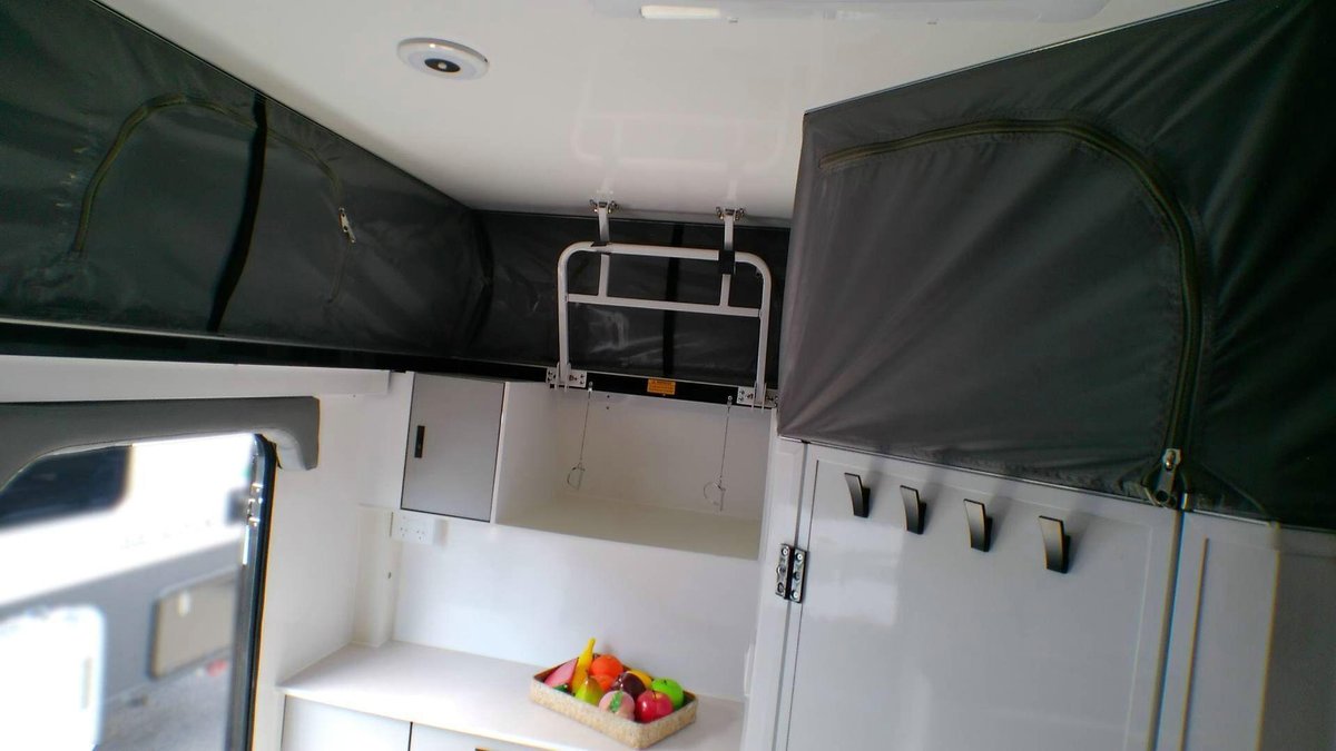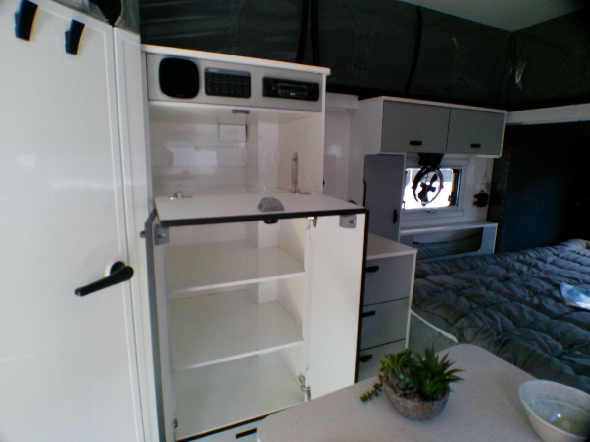 Hot-dip galvanised chassis: Maximum corrosion resistance and long-term strength Independent coil-spring suspension: Twin shock absorbers for stability on uneven terrain 16-inch alloy wheels + mud-terrain tyres: Superior grip and durability on gravel and sand Stone-plate protection: Shields the front end from debris on rough roads Off-road underpinnings: Built to handle remote touring and rugged tracks Pop-top roof design: Lower towing height + full standing room when opened 2. Interior, Furniture & Fittings Despite its compact footprint, the Rapid 13 delivers a surprisingly spacious and comfortable interior — perfect for couples who want premium features in a small van.